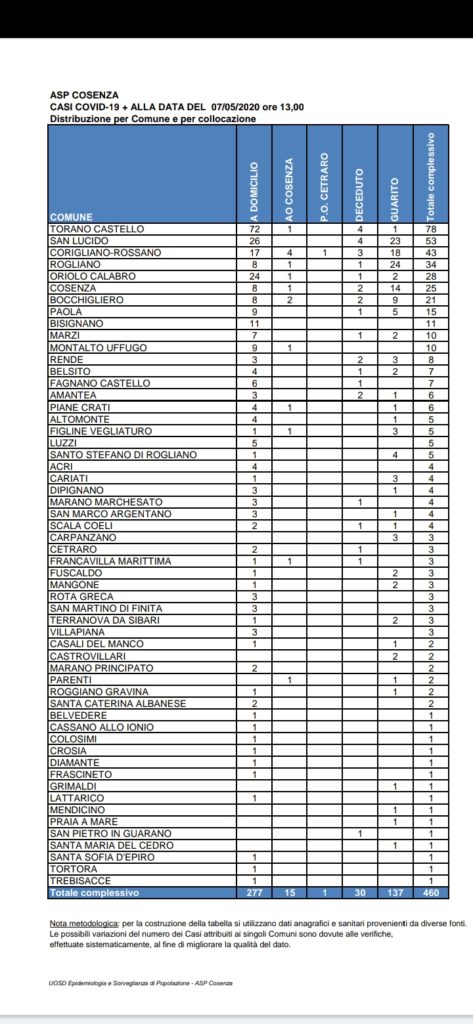 Sono 460 i casi di positività totali nella provincia di Cosenza. Primo guarito nel comune di Torano Castello. Altro paziente negativizzato a San Lucido.