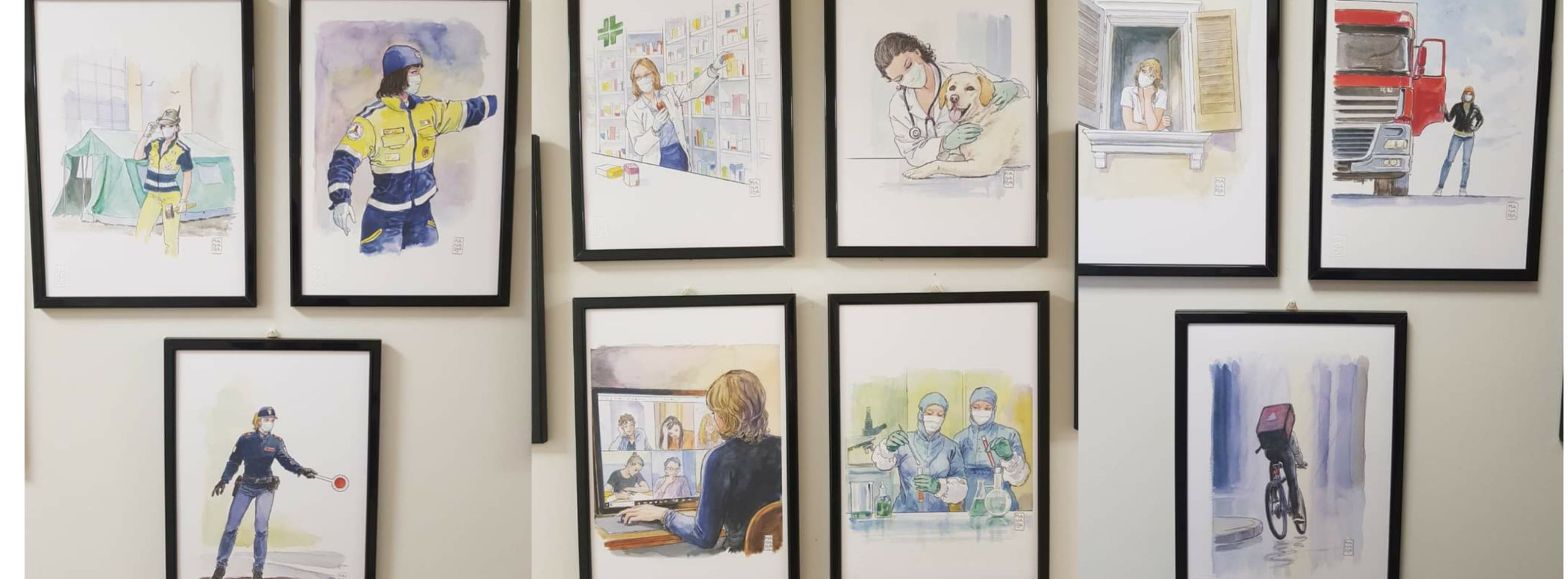 In ogni quadro, l’artista ha dato forma e colore a chi ha combattuto il virus, immortalando, con il suo tratto, le attività essenziali durante il lookdown.