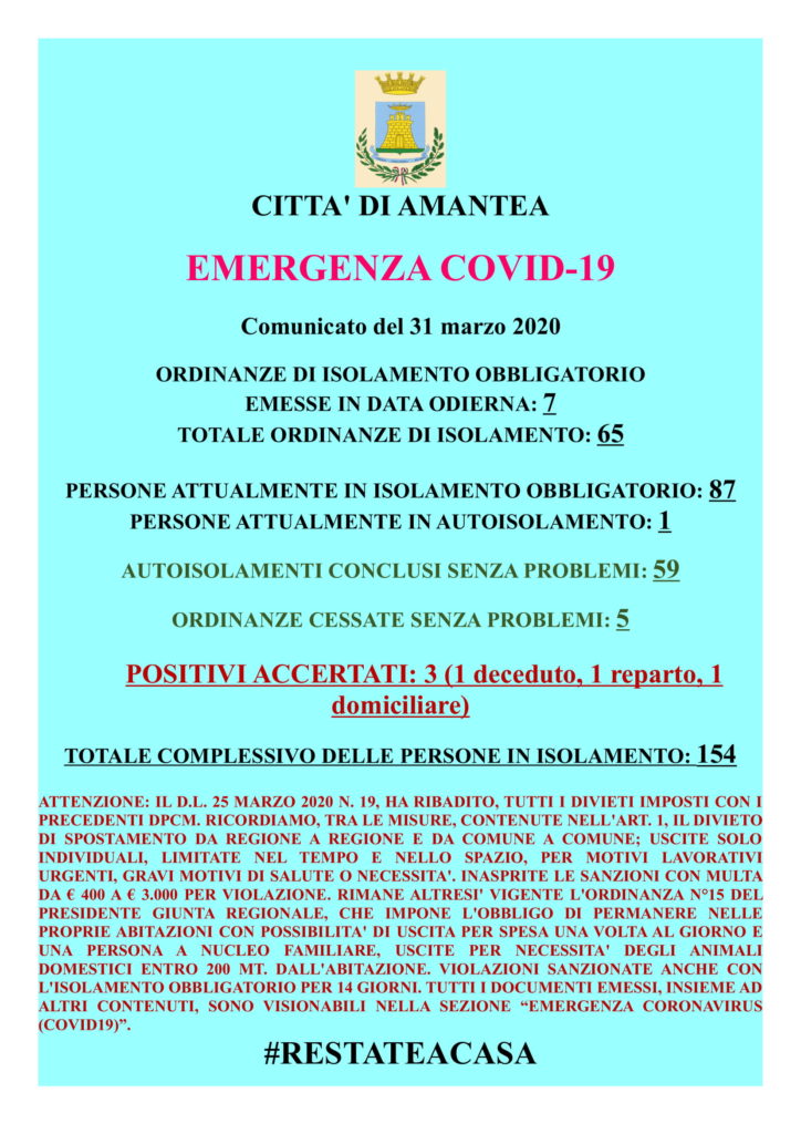 Il Centro Operativo Comunale, ha diramato ieri sera, i dati sull’emergenza Covid19 nel comune di Amantea. Il quadro è abbastanza rassicurante e stabile. Eccolo qui di seguito.