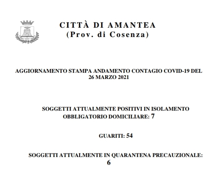 Il comune di Amantea, tramite la propria pagina ufficiale, ha reso noto i numeri dell’emergenza Coronavirus, aggiornati alla giornata di ieri, 26/03/2021.