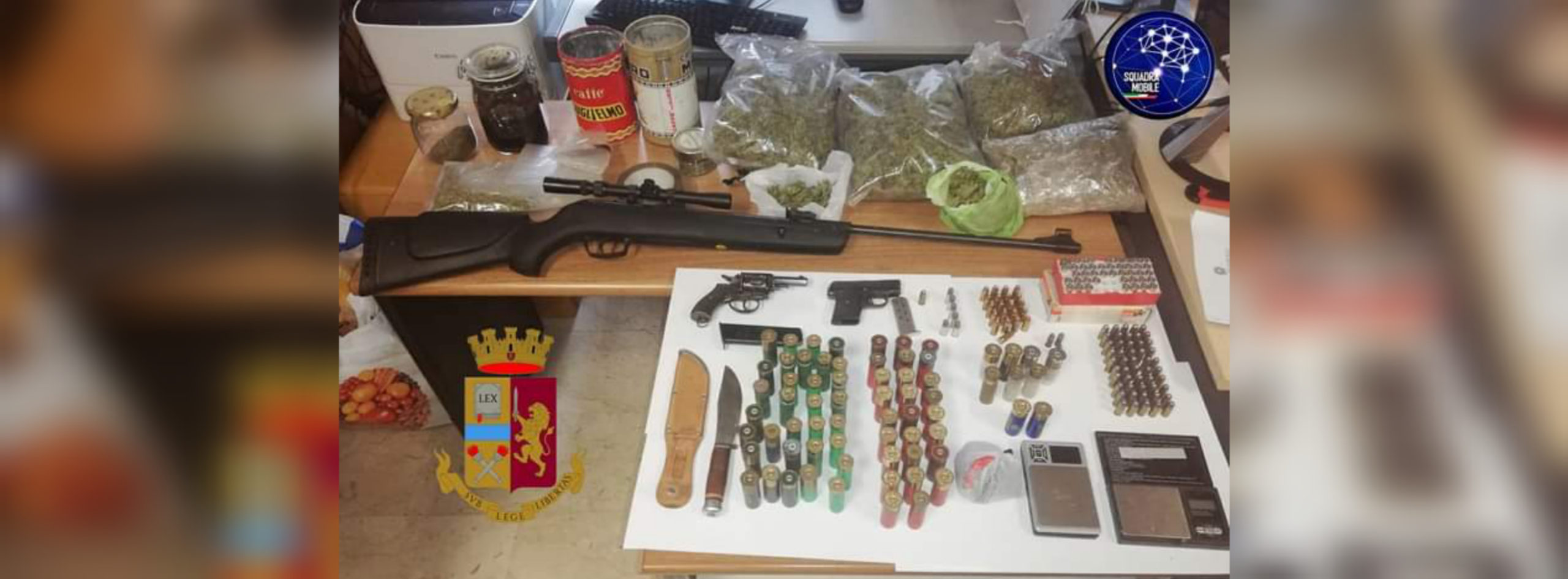 La perquisizione è stata poi estesa presso l’abitazione dell’uomo, dove, oltre ad altra sostanza stupefacente del tipo marijuana, ad una carabina ad aria compressa con ottica di precisione, a un pugnale, a un barattolo di vetro contenente olio di marijuana e a due bilancini di precisione, gli agenti rinvenivano e sequestravano anche un revolver marca cal. 32 e una pistola semiautomatica marca Regina cal. 6,35, ambedue sprovvisti di matricola.