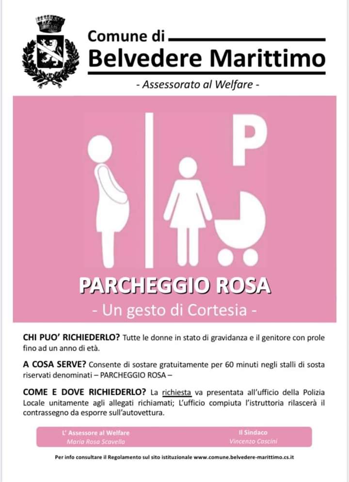 Questa Amministrazione Comunale, nell’ambito di una politica volta al miglioramento delle pari opportunità e della qualità della vita, intende facilitare e sostenere la mobilità delle donne in stato di gravidanza e dei genitori con prole fino ad 1 anno. A tal fine, per agevolare attività come la prolungata ricerca di parcheggio, la ricerca del ticket per il pagamento della sosta, nonché operazioni di carico e scarico che possono rappresentare un serio problema di affaticamento fisico, sono stati creati, per tale categoria, stalli di sosta riservati definiti “Parcheggi Rosa”.
