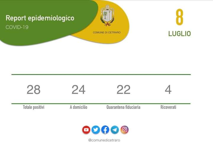 “Si registrano +2 nuovi positivi già in quarantena fiduciaria. 7 tamponi effettuati dall’Usca sulla rete dei contatti sono risultati negativi. Si attende l’esito dei restanti tamponi che verranno aggiornati dopo comunicazione ufficiale”. È quanto rende noto l’amministrazione comunale di Cetraro tramite la pagina ufficiale.