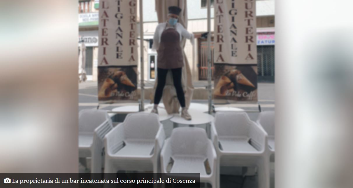 “Protesta forte, ma simbolica, della titolare di un noto bar sul corso principale di Cosenza. Le sue rimostranze hanno portato la donna ad incatenarsi all’esterno dell’attività dopo l’annullamento dell’ordinanza regionale.