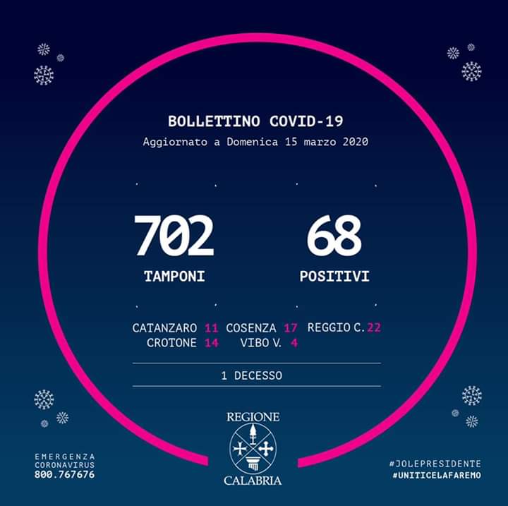 In Calabria ad oggi sono stati effettuati 702 tamponi.Le persone risultate positive al Coronavirus sono 68, quelle negative sono 634.