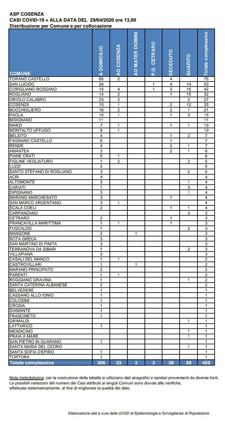 Restano 450 i casi di positività al Coronavirus nella Provincia Di Cosenza. 89 i guariti, 28 i decessi, 306 le persone in isolamento domiciliare.