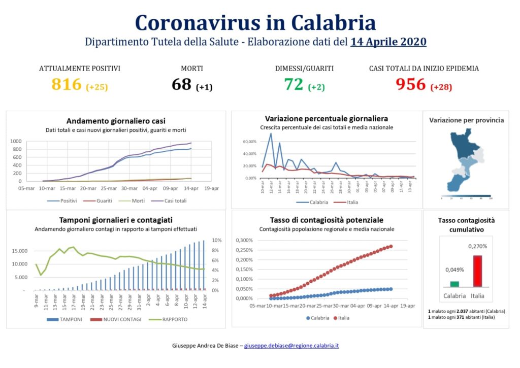 Territorialmente, i casi positivi sono così distribuiti:- Catanzaro: 57 in reparto; 5 in rianimazione; 85 in isolamento domiciliare; 23 guariti; 23 deceduti- Cosenza: 48 in reparto; 4 in rianimazione; 229 in isolamento domiciliare; 15 guariti; 19 deceduti- Reggio Calabria: 32 in reparto; 3 in rianimazione; 195 in isolamento domiciliare; 23 guariti; 15 deceduti- Vibo Valentia: 7 in reparto; 50 in isolamento domiciliare; 6 guarito; 5 deceduti- Crotone: 17 in reparto; 84 in isolamento domiciliare; 5 guariti; 6 deceduti