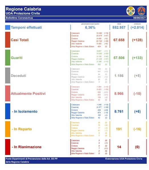 Di seguito il bollettino con i dati regionali sull’emergenza epidemiologica di Covid-19, diffusi dal dipartimento Tutela della salute della Regione Calabria.