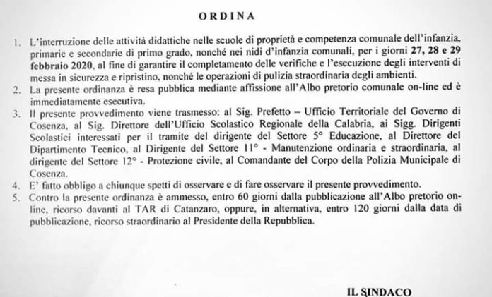 Dai sopralluoghi effettuati dai tecnici nelle scuole di competenza comunale, dopo il terremoto del 24 febbraio scorso, non sono emerse problematiche strutturali, ma è necessario completare le verifiche, eseguire alcuni interventi di messa in sicurezza e ripristino di elementi non strutturali e procedere ad una pulizia straordinaria degli ambienti scolastici. Per garantire questi interventi il Sindaco Mario Occhiuto ha firmato un’ordinanza contingibile e urgente che dispone la chiusura delle scuole per tre giorni: 27, 28 e 29 febbraio.