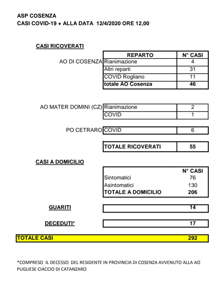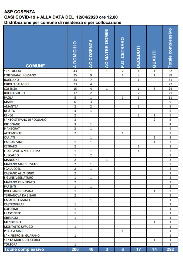 Sono 292 i casi positivi al coronavirus registrati tra Cosenza e provincia dall’inizio dell’emergenza.