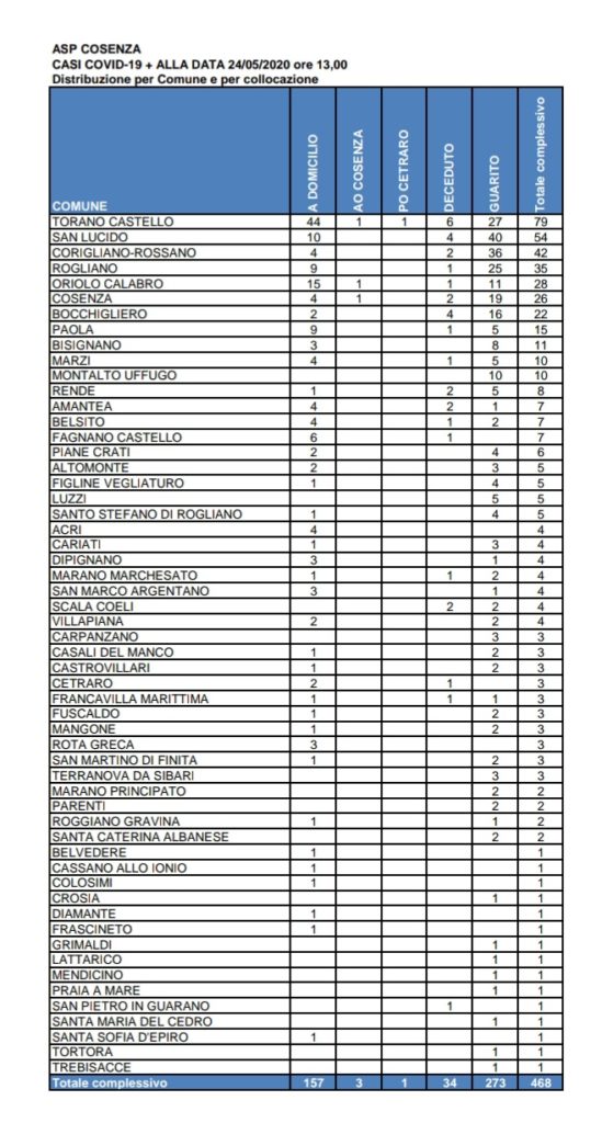 Home Cronaca Dati ASP della Provincia di Cosenza -Comune per comune-CronacaDati ASP della Provincia di Cosenza -Comune per comune-Da Pillamaro.it - 24 Maggio 2020489FacebookTwitterWhatsAppLinkedinTelegramCopy URL Articoli correlatiDi più dello stesso autore CronacaTragedia sfiorata, mostra la pistola all’amico e parte un colpo: giovane in prognosi riservata CronacaLa Polizia di Stato chiude due centri scommesse dove venivano effettuati prestiti irregolari ai giocatori. CronacaForestali, la Corte d’Appello dà torto a Calabria Verde: “Sì ai rimborsi chilometrici, illegittimi i tagli forfettari”Post della settimanaIncidente stradale auto-moto, giovane in prognosi riservata 5 Dicembre 2025Nasconde tra i vestiti le dosi di Cocaina da spacciare: Arrestato... 2 Dicembre 2025Cetraro, l’allarme. Scuola Militerni chiusa per emergenza igienico-sanitaria. FI chiede trasparenza 2 Dicembre 2025Al Reparto di Medicina Lungodegenza dell’Ospedale di Cetraro: «Grazie per quello... 5 Dicembre 2025La Polizia ferma un cittadino ritenuto pericoloso per la Sicurezza Pubblica 2 Dicembre 2025
