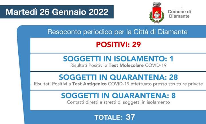 Sono 29 le persone ancora positive a Diamante. Trentasette le quarantene attive. Rallenta il patogeno anche nella vicina Belvedere Marittimo. Le tante inoculazioni di vaccino Anti-Covid e lo screening gratuito stanno sortendo gli effetti desiderati. 76 i positivi. Si attendono ulteriori miglioramenti nei prossimi giorni. Intanto, il primo cittadino di Diamante, Ernesto Magorno rende noto: “Continuano a diminuire i positivi a Diamante: da 39 a 29 nell’ultima rilevazione. Occorre comunque continuare a seguire regole e indicazioni per prevenire i contagi da Covid, a cominciare dall’uso delle mascherine e delle norme di stanziamento sociale . Così come si rinnova l’invito a vaccinarsi, e a tal proposito ricordiamo che venerdì dalle 15 alle 18 presso il centro vaccinale di Diamante (Parco La Valva) ci si potrà vaccinare senza prenotazione. Non mancate questa occasione”.