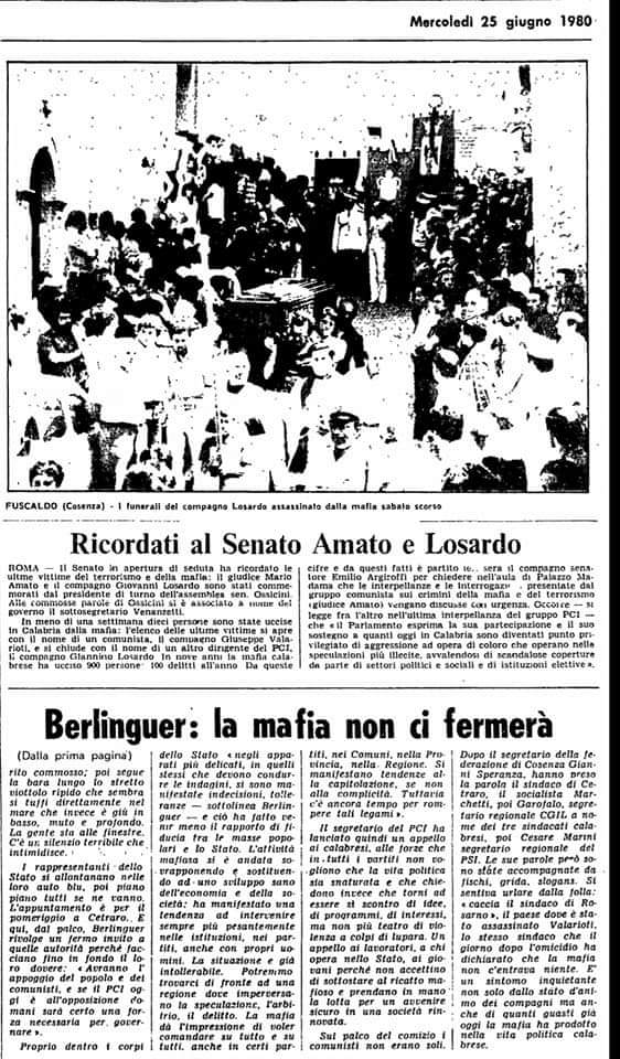 Dieci giorni dopo l’uccisione di Giuseppe Valarioti (11 giugno del 1980) Segretario della sezione del Pci di Rosarno, seguì l’assassinio di Giannino Losardo (21 giugno 1980).