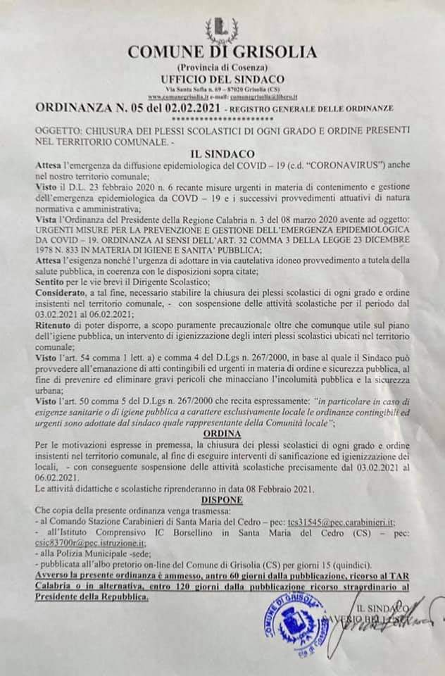 Il sindaco, Saverio Bellusci, ha emesso odinanza di chiusura, in via cautelativa e precauzionale di tutti i plessi scolastici di Grisolia, per interventi di sanificazione dal 03/02/2021 al 06/02/2021.