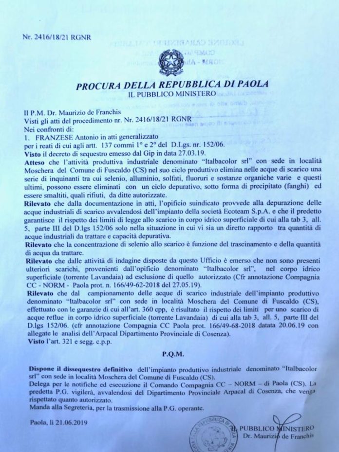 Sono stati rimossi oggi i sigilli da Italbacolor. E adesso il provvedimento della Procura di Paola è definitivo. Il dissequestro nei confronti della fabbrica di Fuscaldo è consequenziale ai risultati delle analisi sulle acque di scarico del depuratore.