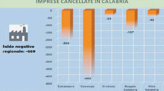 In questi primi tre mesi, in Calabria, sono sparite, complessivamente, 869 imprese. Un saldo negativo che è conseguenza di 2.604 nuove iscrizioni e 3.089 cessazioni di attività. Il tasso di crescita è crollato fino a – 0,46%. Un anno fa, nello stesso periodo, era a – 0,31%.