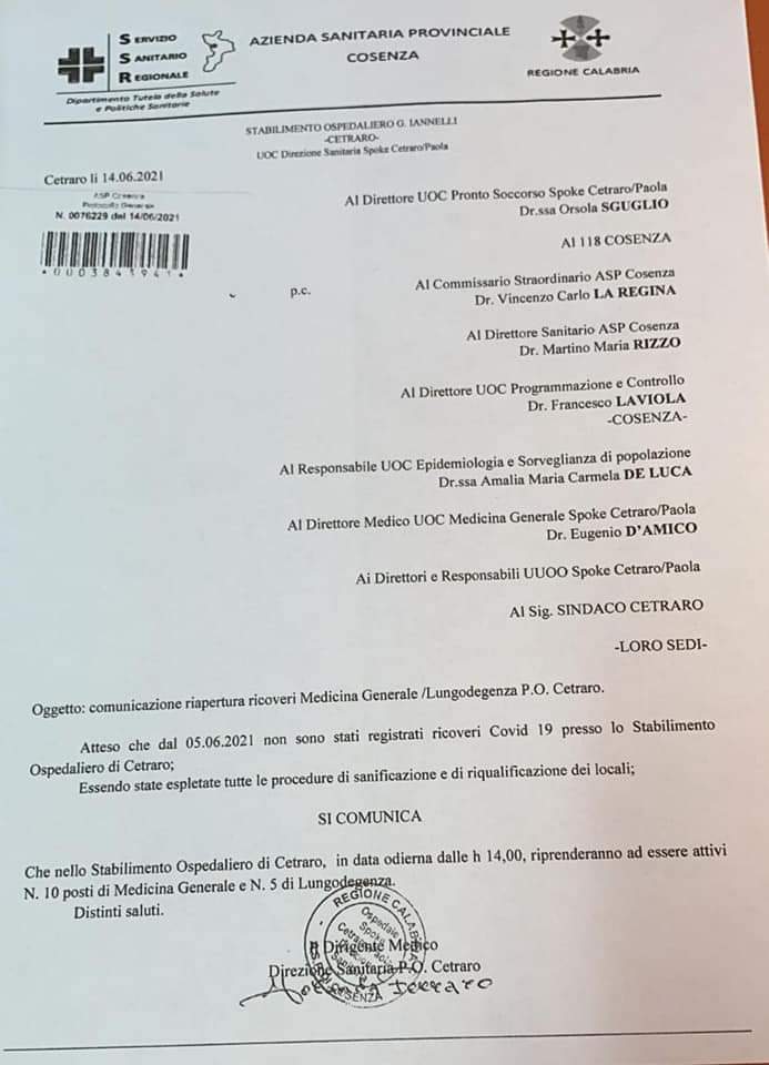 “Qualche giorno addietro avevo chiesto al commissario dell’Asp di valutare la possibilità di riattivare dieci posti letto di medicina generale e cinque di lungodegenza. Quella nostra richiesta è stata valutata positivamente. Si chiude un capitolo che ha destato perplessità e preoccupazioni. Da oggi, riprendono le normali attività». Lo ha affermato, nella giornata di ieri, il sindaco di Cetraro, Ermanno Cennamo. Da come si evince da un documento Asp che arreca la data di oggi, dalle ore 14 saranno messi in funzione dieci posti di Medicina Generale e cinque di Lungodegenza. Le operazioni di ripristino sono state possibili perché dal 5 giugno scorso non si registrano più ricoveri per Covid-19 nella struttura.