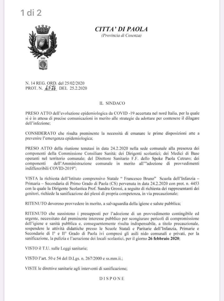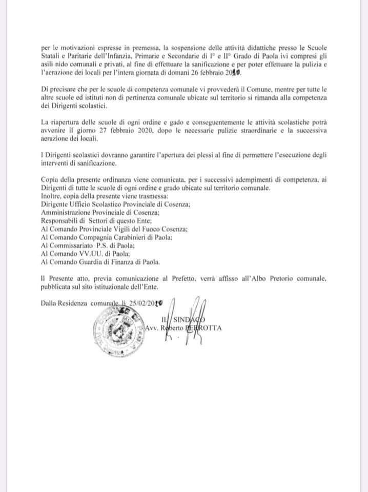Home Cronaca Paola, domani scuole chiuse per disinfestazione dei localiCronacaPaola, domani scuole chiuse per disinfestazione dei localiDa Pillamaro.it - 25 Febbraio 2020453FacebookTwitterWhatsAppLinkedinTelegramCopy URL Articoli correlatiDi più dello stesso autore CronacaTragedia sfiorata, mostra la pistola all’amico e parte un colpo: giovane in prognosi riservata CronacaLa Polizia di Stato chiude due centri scommesse dove venivano effettuati prestiti irregolari ai giocatori. CronacaForestali, la Corte d’Appello dà torto a Calabria Verde: “Sì ai rimborsi chilometrici, illegittimi i tagli forfettari”Post della settimanaA San Lucido la presentazione dello sportello d’ascolto. Ospiti autorevoli e... 3 Dicembre 2025Viola il divieto di ritorno nel proprio comune: denunciato 5 Dicembre 2025Diamante, MC Donald’s, i gruppi di minoranza chiedono atti e documenti:... 29 Novembre 2025Paola, ecco il multimediale di San Francesco: un omaggio interattivo al... 3 Dicembre 2025Paola. Ordine dei Commercialisti, nasce la lista “Continuità&Innovazione” con Ciriaco Riente... 30 Novembre 2025