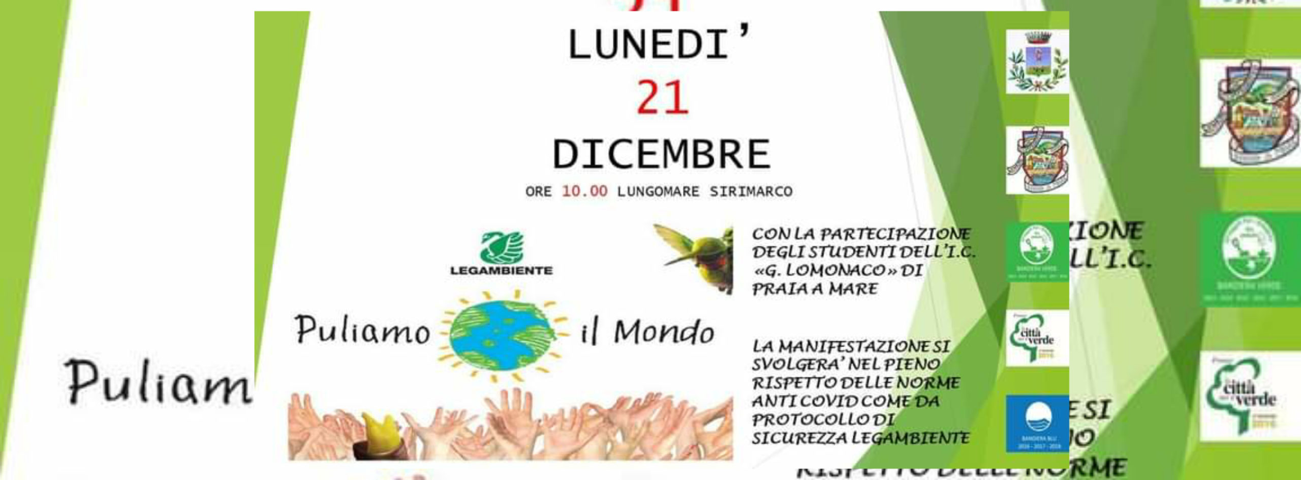 Lunedì 21 dicembre, dalle ore 10,00 alle ore 12,30, le classi seconde e la classe I A (scelta a sorteggio tra le classi prime) della Scuola Secondaria di I grado, in collaborazione con l’Amministrazione comunale, parteciperanno alla giornata ecologica “Puliamo il mondo” organizzata dalla Lega Ambiente.