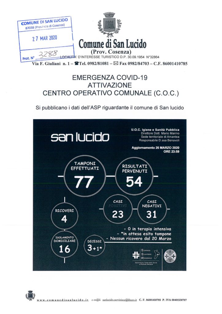 Home Cronaca San Lucido, casi di positività al covid19, i dati aggiornatiCronacaSan Lucido, casi di positività al covid19, i dati aggiornatiDa Pillamaro.it - 27 Marzo 20202743FacebookTwitterWhatsAppLinkedinTelegramCopy URL Bollettino di oggi… fonte: http://www.comune.sanlucido.cs.it/Articoli correlatiDi più dello stesso autore CronacaTragedia sfiorata, mostra la pistola all’amico e parte un colpo: giovane in prognosi riservata CronacaLa Polizia di Stato chiude due centri scommesse dove venivano effettuati prestiti irregolari ai giocatori. CronacaForestali, la Corte d’Appello dà torto a Calabria Verde: “Sì ai rimborsi chilometrici, illegittimi i tagli forfettari”Post della settimanaGrande paura nel Cosentino. Camion sbanda e finisce in un bar 2 Dicembre 2025Forestali, la Corte d’Appello dà torto a Calabria Verde: “Sì ai... 5 Dicembre 2025Al Reparto di Medicina Lungodegenza dell’Ospedale di Cetraro: «Grazie per quello... 5 Dicembre 2025Viola il divieto di ritorno nel proprio comune: denunciato 5 Dicembre 2025Truffatore smascherato: finge di essere Carabiniere e ruba gioielli per 30.000€... 1 Dicembre 2025