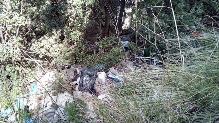 I rifiuti erano stati scaraventati lungo una ripida scarpata tra le piante di una fitta vegetazione: decine e decine di pneumatici fuori uso, plastica, vetro, resti di animali, cemento, mattoni, materiali contenenti amianto ecc.