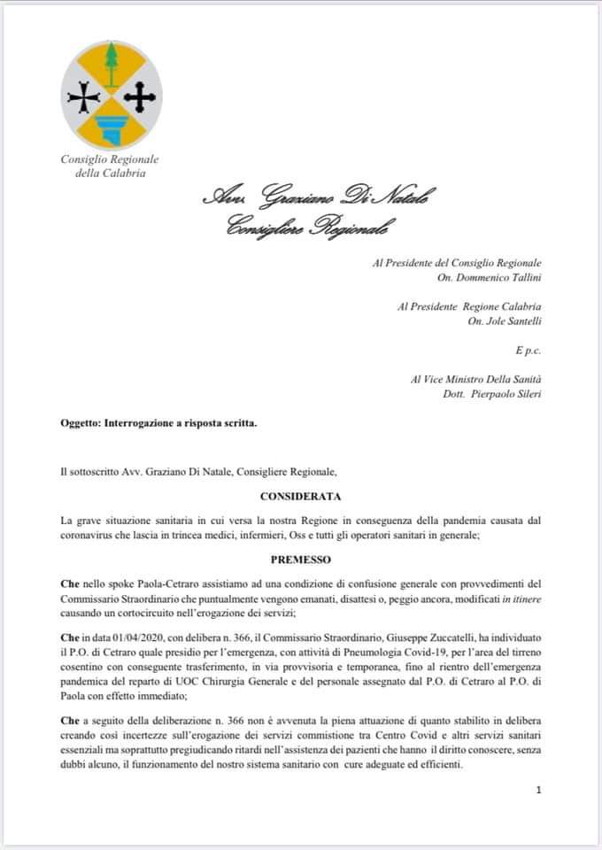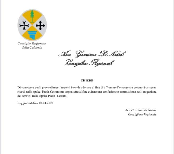 In questo contesto, al fine di tutelare il diritto alla salute, irrompe Graziano Di Natale, neo consigliere della regione Calabria. Il segretario Questore regionale, ha interrogato, Jole Santelli, presidente della regione Calabria, il vice ministro della sanità, Pierpaolo Sileri, ed il presidente del consiglio regionale, Domenico Tallini.