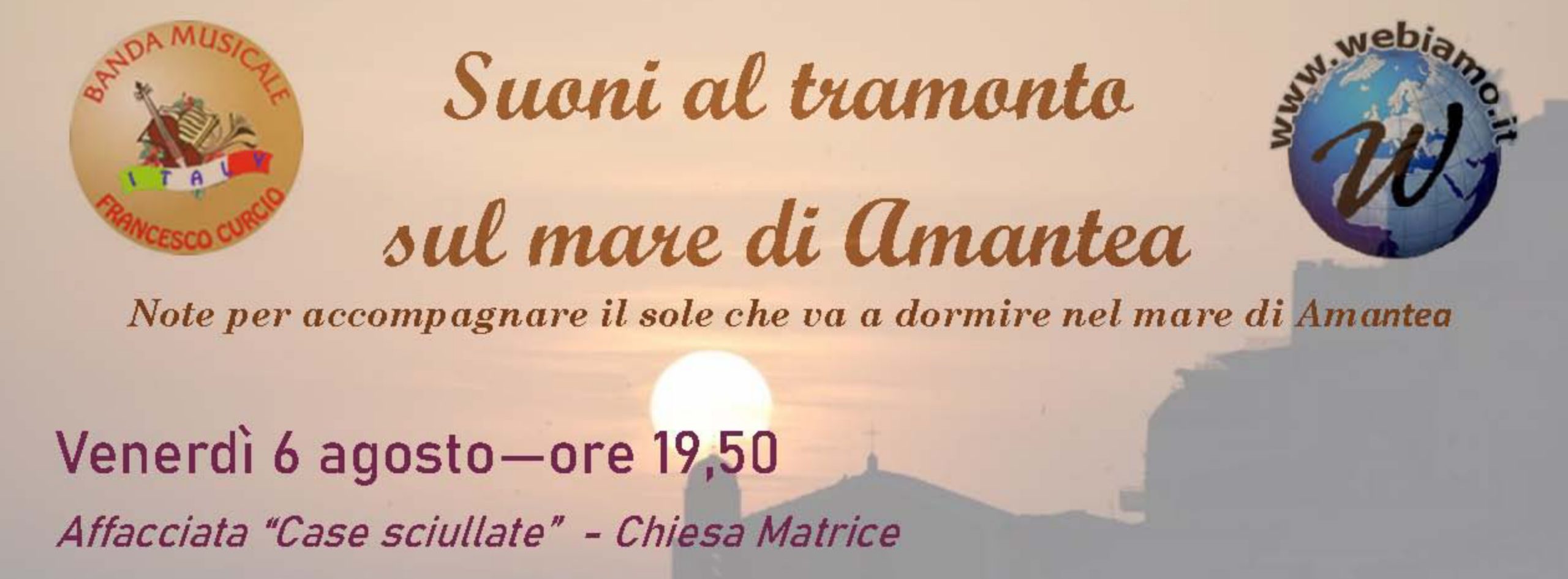 L’incanto del tramonto sul mare di Amantea, con il suggestivo sfondo degli scogli di Isca, dell’isola di Stromboli ed i colori del cielo e del mare, sarà accompagnata dal commento musicale di giovani esecutori. Questa è la sintesi dell’iniziativa della Banda Musicale “Francesco Curcio” che alla bellezza naturalistica, paesaggistica e artistica dei luoghi della cittadina tirrenica, aggiungerà la bellezza della musica.