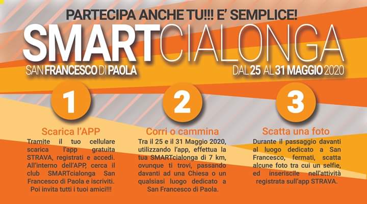 - Nella settimana dal 25/05/2020 al 31/05/2020, utilizzando l’App, effettua la tua SMARTcialonga (attività di corsa o camminata nel rispetto delle distanze sociali) con un percorso di 7 km, passando davanti ad una chiesa, un monumento o un qualsiasi luogo (piazza, via, località, ecc.) dedicato a San Francesco di Paola.