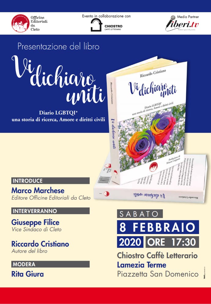 Giorno 8 febbraio 2020 presso il Chiostro Caffè Letterario piazzetta San Domenico, alle ore 17:30 sarà presentato il libro di Riccardo Cristiano “Vi dichiaro uniti – Diario LGBTQI* una storia di ricerca, Amore e diritti civili, edito da Officine Editoriali da Cleto. Il libro narra le vicende dell’autore e del suo percorso verso la piena consapevolezza oltre che raccontare gli incontri importanti avvenuti nell’arco di 40 anni di vita. Scritto da Riccardo Cristiano, Presidente di Liberi.tv e attivista insieme al suo attuale marito Marco Marchese nelle battaglie civili, è il primo in Italia a parlare della prima unione civile registrata in Calabria fra due uomini, ma anche l’unico libro in Italia che racconti il festoso giorno del matrimonio da parte degli sposi! La prefazione è di Marco Cappato, Tesoriere dell’associazione Luca Coscioni e già Presidente di Radicali Italiani, simbolo di chi ha a cuore il diritto di scelta della persona in quanto tale, lui che si è battuto e si batte da anni per la laicità dello stato e lo stato di diritto. Modererà la presentazione Rita Giura, amica dell’autore, mentre saranno presenti il Vice Sindaco di Cleto, Giuseppe Filice e l’editore Marco Marchese. A proposito del libro, Riccardo Cristiano dichiara: “il mio diario appartiene a tutti quelli che non si sono arresi e non vogliono arrendersi alle etichette nelle quali spesso ognuno di noi è tenuto a ritrovarsi. E’ una storia, la mia storia, ma anche quella di persone straordinarie incontrate lungo il percorso che, fortunatamente, non ho ancora concluso. Si parla di diritti civili, amore, sessualità, disabilità, transessualità, famiglia, ma più semplicemente di come ognuno meriti di essere felice rimanendo sé stesso. Il libro ho voluto dedicarlo alle persone che contano di più nella mia vita, coloro i quali mi sono stati vicini nel bene e nel male, perché, cosa saremmo senza l’Amore e l’Amicizia?” Prima di congedarci, abbiamo voluto fargli un’altra domanda apparentemente scomoda, ovvero: la Calabria è una terra omofoba? “la mia personale esperienza mi porta a credere che ogni cosa che non si conosce fa paura e se spaventa non viene capita. C’è chi si pone in maniera aperta e non bada alle differenze, che poi nemmeno ci sono se ci pensiamo bene. Ho la fortuna di vivere a Cleto, un luogo meraviglioso dove i cittadini ci hanno accolto sin da subito, abbiamo intrecciato rapporti sinceri, d’amicizia e stima e mai abbiamo sentito lo stigma sociale della discriminazione. So che ci sono luoghi e persone che vanno educate, passatemi il termine, alla scoperta dell’altro, perché è solo comprendendoci a vicenda, rispettandoci che possiamo crescere insieme. Il mio libro nasce proprio da questo concetto: tutti hanno una storia da raccontare, anche l’omofobo che discrimina una persona per il suo orientamento sessuale, gli chiederei di leggerne qualche pagina e poi di chiedersi cosa c’è di male nell’amare qualcuno, punto. L’omofobia come il razzismo si curano con la cultura e la conoscenza dell’altro, non c’è altro rimedio. Appuntamento quindi a Lamezia Terme al Chiostro Letterario, Piazzetta San Domenico sabato 8 febbraio ore 17:30, “Vi dichiaro uniti” un libro che sta scalando le classifiche degli autori emergenti, un libro che merita di essere letto fino all’ultima pagina.
