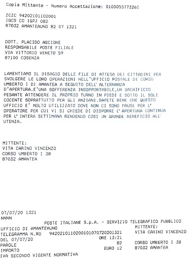 I CITTADINI CHIEDONO L’AMPLIAMENTO DELL’ORARIO DI APERTURA TELEGRAMMA DI SOLLECITAZIONE INVIATO ALLA DIREZIONE DELLE POSTE.