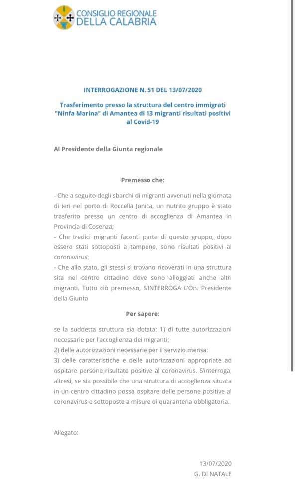“La questione non è quella di evidenziare che si tratta di migranti ma al contrario se sono state adottate tutte le misure previste per tutelare la salute degli ospiti e dei cittadini di Amantea. Nello specifico -Prosegue Di Natale- ho chiesto di sapere:
