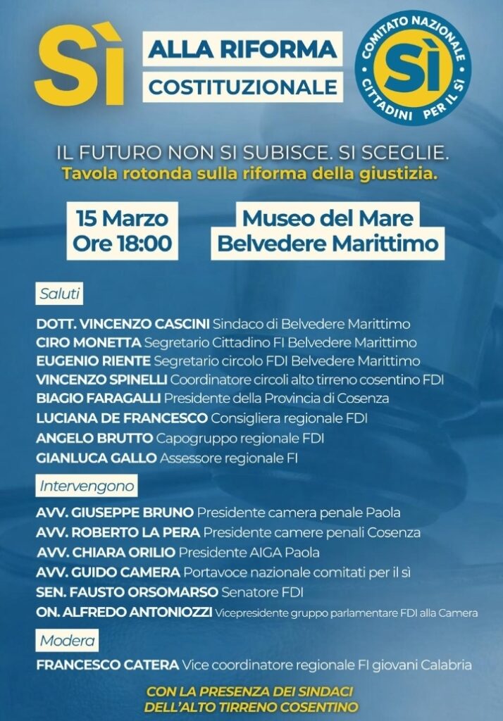 BELVEDERE MARITTIMO- «Il Futuro non si subisce, si sceglie». È questo il motto scelto in ottica referendaria da Fratelli D’Italia e Forza Italia che si ritroveranno a Belvedere Marittimo, in una tavola rotonda, il 15 Marzo alle ore 18:00 nei locali del museo del mare per illustrare le ragioni del SI sul Referendum sulla giustizia. I principali partiti della coalizione di centrodestra che governa a Roma, alla Regione Calabria e alla Provincia di Cosenza scendono in campo nella ridente cittadina della Riviera dei Cedri con tutti i big.