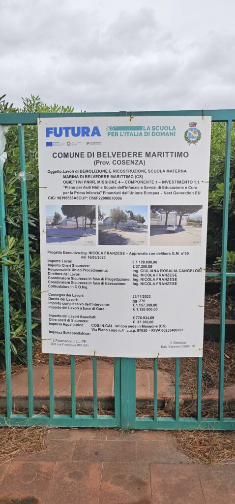 BELVEDERE MARITTIMO- I lavori di demolizione e ricostruzione della scuola materna della marina, ubicata sul lungomare di Belvedere Marittimo, nei pressi della Chiesa, sono fermi, e potrebbero ripartire prima di Natale, o più presumibilmente dopo le festività natalizie (foto)