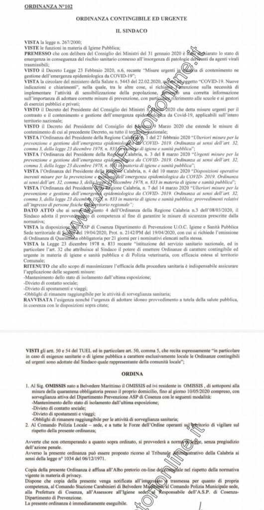 Con una serie di ordinanze (Esempio quella N.102 dell’albo pretorio del comune di Belvedere Marittimo) il sindaco Vincenzo Cascini, ha ordinato la quarantena obbligatoria presso il proprio domicilio, al paziente risultato positivo al coronavirus ed alle persone che hanno avuto contatti con lui (ovviamente quelle Finora rintracciate).