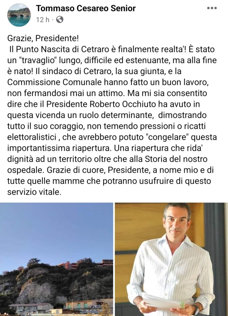 CETRARO- Incredibile ma vero. Una vera e propria frittata social. Accade infatti a Cetraro che il sindaco, Ermanno Cennamo esulti ieri sera per una presunta riapertura del punto nascita dello Iannelli chs al momento non c’è. Tanti messaggi, tanti complimenti e come spesso accade la politica sale in cattedra. Il vicesindaco di Cetraro, Tommaso Cesareo esalta il presidente Occhiuto, ringraziandolo del risultato ottenuto (Foto)