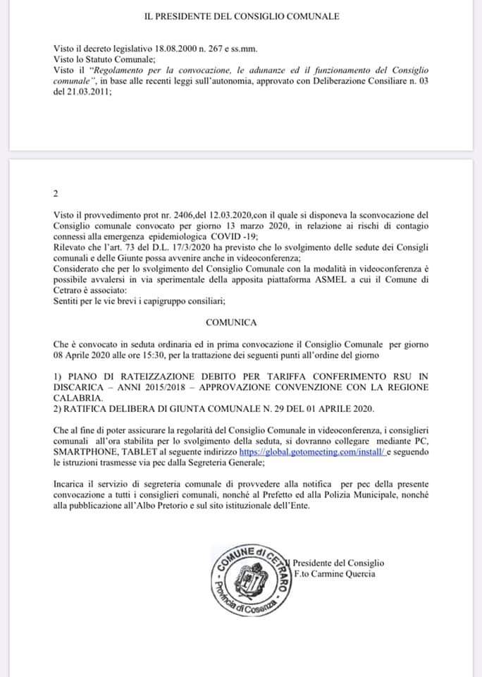 Non si ferma l’attività amministrativa ed istituzionale del Comune di Cetraro e grazie al decreto varato nei giorni scorsi si è potuto dare seguito alla convocazione del consiglio comunale in video conferenza.