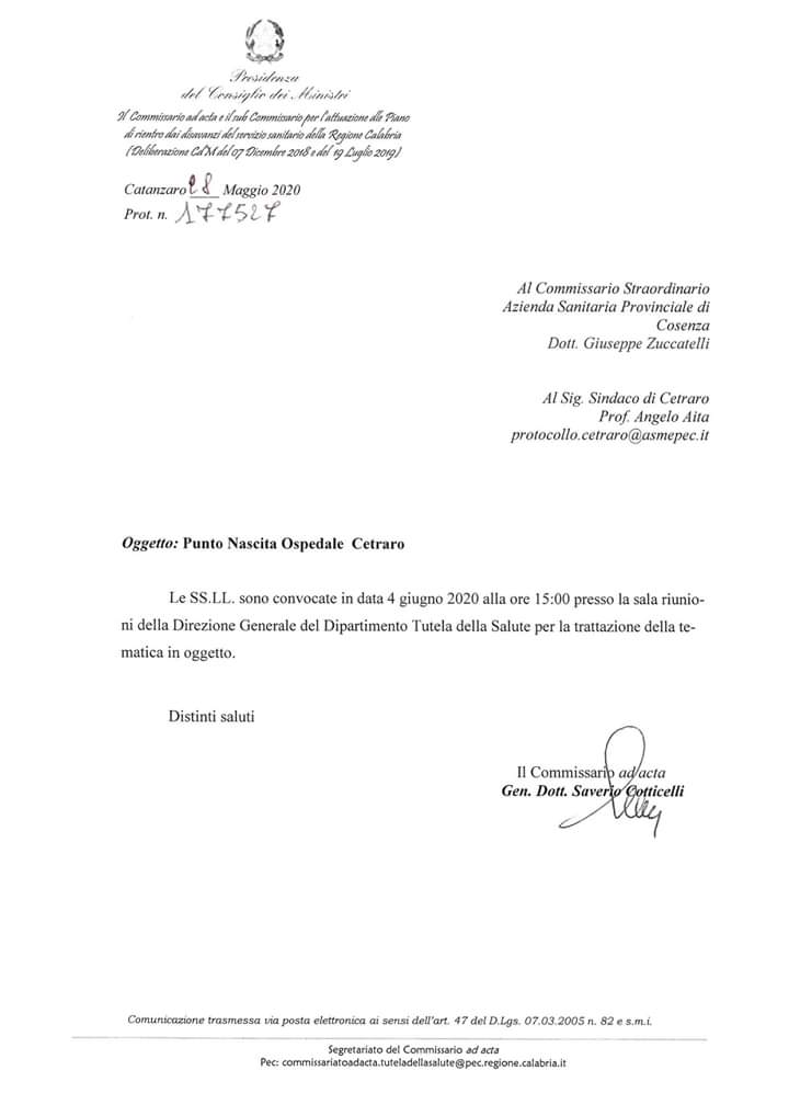 Come si evince dalla nota sotto riportata, nella giornata di oggi sono stato convocato dal Commissario Cotticelli per giorno 4 giugno alle ore 15.00, insieme al Commissario ASP Zuccatelli, per affrontare la questione del Punto Nascita di Cetraro.