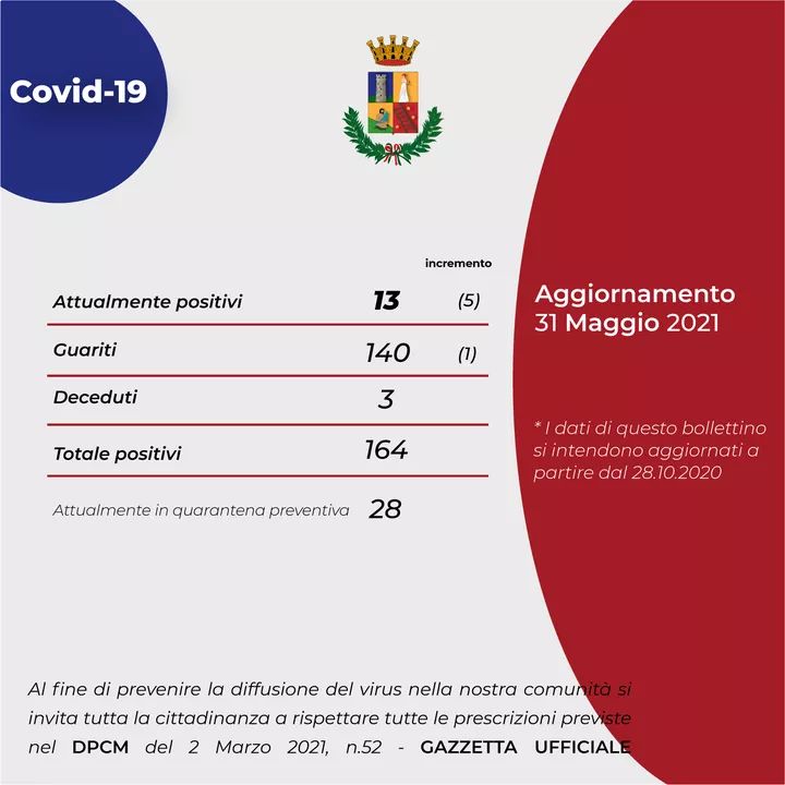 “Aggiornamento bollettino Covid-19 del 31 maggio. Oggi registriamo 5 nuovi positivi e un nuovo guarito. Il totale delle persone in quarantena preventiva è di 28. Vi invitiamo a mantenere alta l’attenzione e rispettare tutte le norme anti-contagio”. Così, l’amministrazione comunale di Scalea.