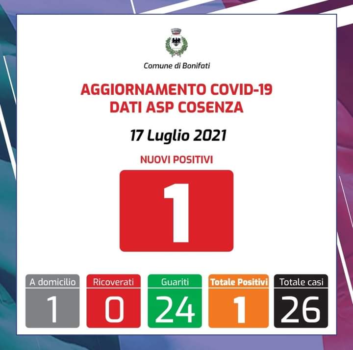 Alla persona coinvolta auguriamo una pronta guarigione mentre a tutti voi rinnoviamo l’invito a non abbassare la guardia. Godiamoci l’estate in sicurezza”. È l’avviso del sindaco del comune di Bonifati, Francesco Grosso.