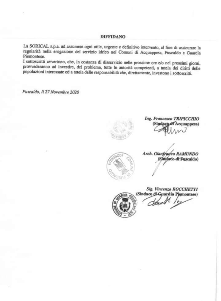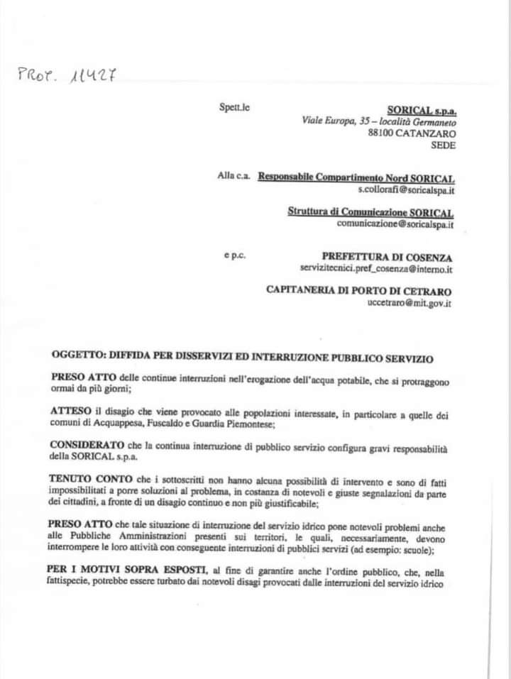 Continui disservizi e rubinetti a secco da giorni. I sindaci di Guardia Piemontese, Acquappesa e Fuscaldo, hanno inoltrato una diffida ufficiale alla Sorical, chiedendo di assumere ogni utile, urgente e definitivo intervento al fine di assicurare la regolarità dell’erogazione del servizio idrico alle nostre comunità. I tre amministratori, Rocchetti, Tripicchio e Ramundo, hanno inviato la diffida, per conoscenza, anche alla Prefettura di Cosenza. “La situazione -commentano i primi cittadini- è ormai insostenibile. Non siamo più disposti a subire ulteriori disagi.