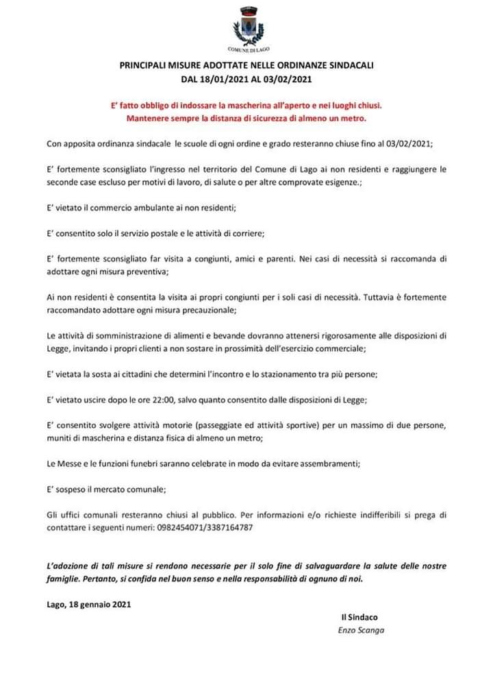 Ieri, il comune, ha diramato una serie di misure adottate nelle ordinanze sindacali (Foto) valide dal 18/01/2021 al 03/02/2021. Tra queste, sospensione del mercatino comunale e la chiusura degli uffici comunali, raggiungibili telefonicamente dai cittadini.