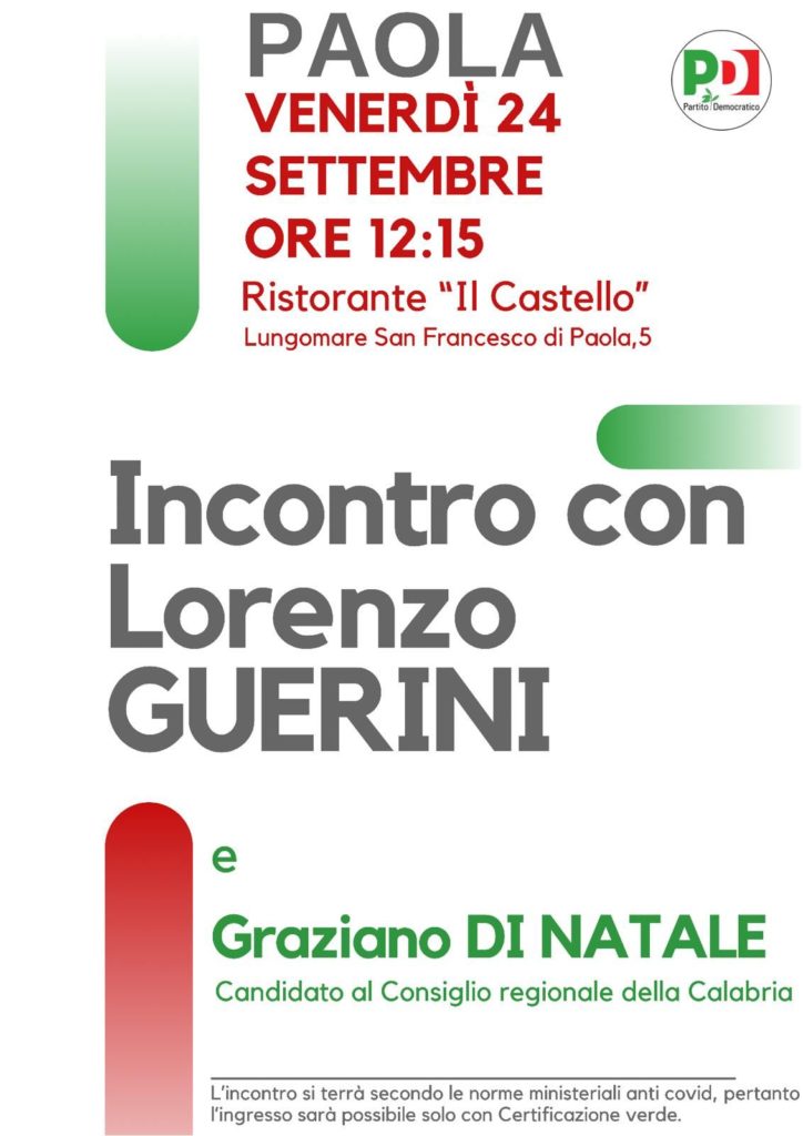 Il Ministro della Difesa, Lorenzo Guerini sarà ospite nella Città di Paola il 24 Settembre per sostenere la candidatura al Consiglio Regionale della Calabria, nella lista del Partito Democratico, dell’On. Graziano Di Natale, Segretario-Questore dell’assemblea regionale e del candidato Presidente Amalia Bruni.