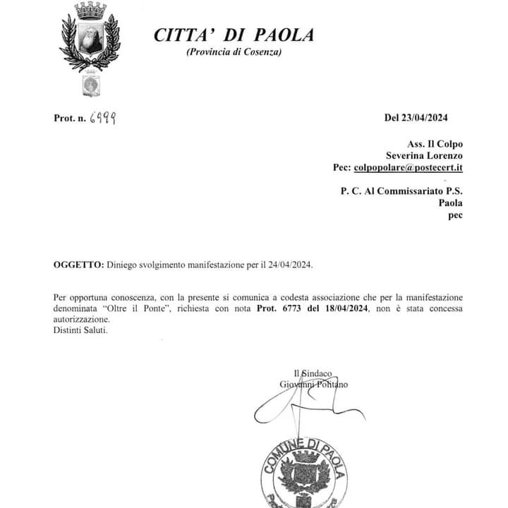 PAOLA- “Convochiamo un’assemblea straordinaria, con così poco preavviso, perché nel corso della mattinata è avvenuto un episodio a nostro parere molto grave. Tramite PEC il comune di Paola ci ha negato l’autorizzazione (concessa il 18 aprile) per i festeggiamenti del “Giorno della Liberazione” in programma per domani. È grave il fatto che nella comunicazione ricevuta manca qualsiasi motivazione, come pure è assente qualsiasi indicazione proveniente della Questura, a cui l’evento era stato comunicato giorni fa. Solo telefonicamente ci è stato riferito che le motivazioni sono da ricondurre a delle proteste del vicinato, lo stesso vicinato con cui ci confrontiamo quotidianamente e con cui abbiamo avuto modo di confrontarci in un’assemblea a cui sono stati invitati in un’ottica di rispetto degli spazi, cooperazione e costruzione di comunità dal basso.