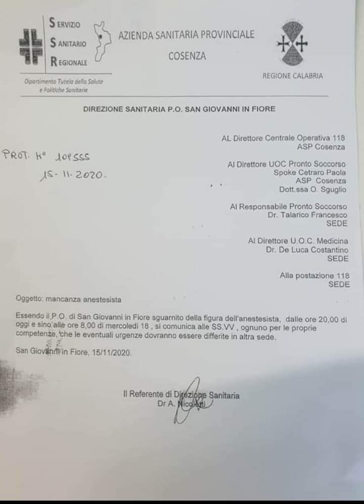 Manca la figura dell’anestesista e dal 15 Novembre 2020 fino a mercoledi 18 Novembre 2020 chiude il Pronto Soccorso dell’ospedale di San Giovanni in Fiore.