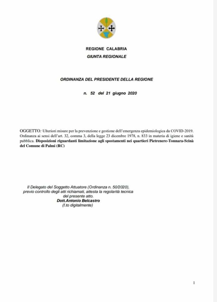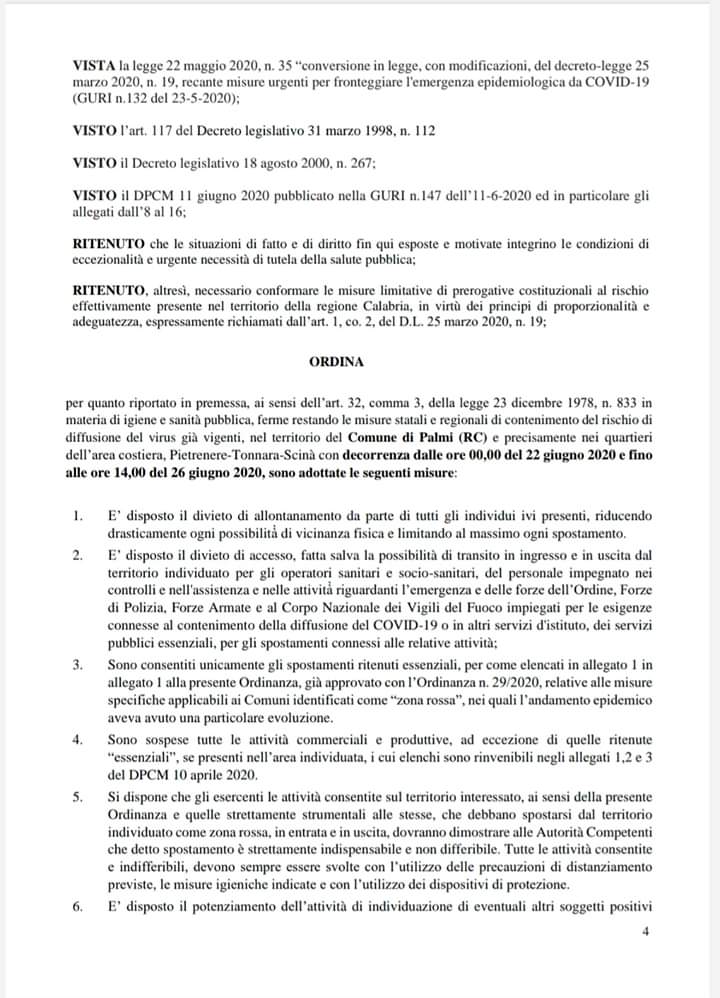 La Regione Calabria ha da poco pubblicato un’ordinanza riguardante la nostra Città. Questa prevede la limitazione agli spostamenti nella zona della Tonnara per un breve periodo, dalle 00.00 di domani, lunedì 22, e fino alle 14.00 di venerdì 26, salvo revoca anticipata qualora ce ne fossero le condizioni. Nel corso della concertazione con la Regione Calabria e tutte le autorità competenti, siamo riusciti a scongiurare una chiusura della città e una chiusura prolungata dell’area costiera. Quattro giorni dunque, per tutelare sia la salute sia la stagione estiva, oltre che per essere certi di ripartire in totale sicurezza. Questo tempo servirà inoltre per effettuare una capillare campagna di screening, nel corso della quale saranno effettuati tutti i tamponi necessari, che ci consentirà di avere un’effettiva contezza della situazione. Durante i fitti colloqui tenuti con i vertici della Regione Calabria e delle autorità competenti, abbiamo concordato le modalità per tenere in debita considerazione le diverse esigenze della nostra città, contemperando le necessità sanitarie ed economiche. Si tratta di una misura che mira a conciliare i diversi interessi in gioco, perché da un lato tutela la salute con uno screening che ci consentirà di avere a breve un quadro reale della situazione, mentre dall’altro costituisce un sacrificio di qualche giorno che ci permetterà poi di ripartire e vivere al meglio e in totale sicurezza tutto per il resto della stagione estiva appena iniziata. Infine, rinnoviamo l’appello ad un comportamento sempre rispettoso delle regole, per il bene della collettività e della nostra città. Con l’impegno di tutti e senso di responsabilità ne usciremo presto e più forti di prima.