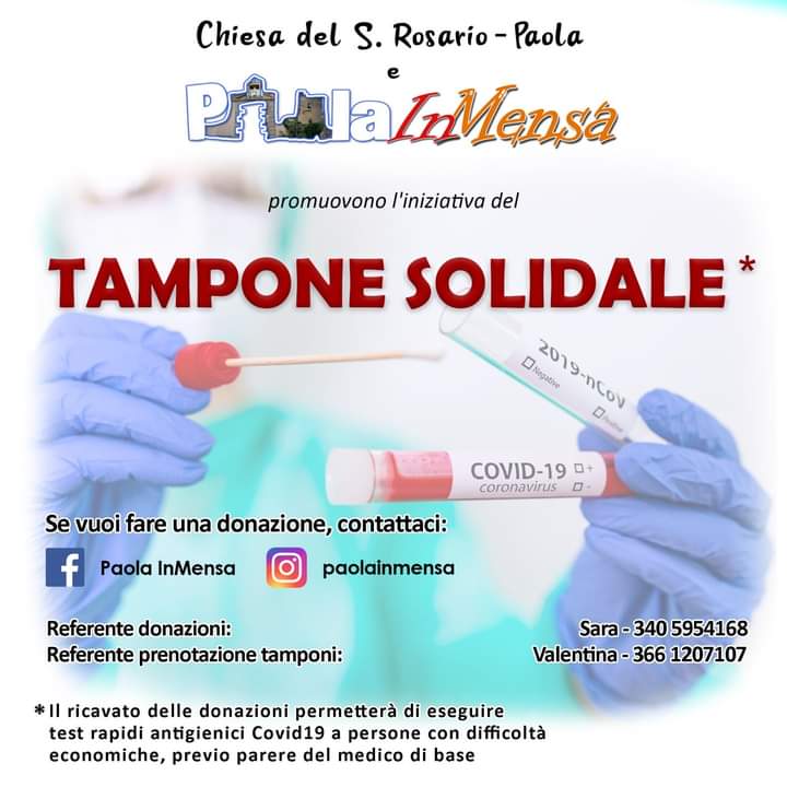 Dell’altruismo dell’associazione “PaolaInMensa” sempre sensibile in ambito sociale, i Paolani, potranno contare sul Tampone solidale. Sono i volontari a darne notizia “TAMPONE SOLIDALE. A partire da oggi, Paola InMensa promuove una raccolta fondi utile per sostenere il costo di test rapidi antigienici COVID19 per persone in difficoltà.