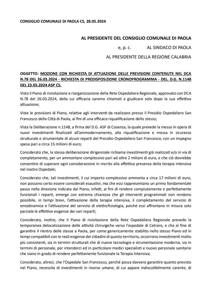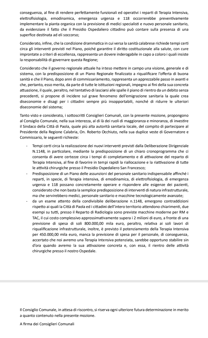 PAOLA- Si è tenuta ieri una importante seduta di consiglio comunale a Paola. Nell’aula F. Lo Giudice, al quarto punto dell’odg, si è discusso della sanità, ed in particolar modo dell’Ospedale San Francesco di Paola, sempre più oggetto della discordia politica mentre la chirurgia è ormai dirottata verso lo Iannelli di Cetraro. La maggioranza di governo è apparsa per lunghi tratti in difficoltà, in balia degli interventi politici della minoranza, per quanto contraddistinti da pacatezza istituzionale. L’opposizione ha elencato – carte alla mano – fatti certi, mettendo in imbarazzo soprattutto i gruppi di Fratelli D’Italia, partito che alla Regione Calabria governa con Occhiuto, e che trova – come risaputo – ampio spazio di manovra nella maggioranza del sindaco Politano. Alla fine della seduta, divenuta aperta per l’importante occasione, la maggioranza ha accettato di votare all’unanimità un documento della dott.ssa Emira Ciodaro. Il capogruppo di Paola Domani ha impartito una dura lezione alla cosiddetta nuova era, incassando un risultato politico di rilievo. L’ex candidata a sindaco ha indicato la strada da seguire, dimostrando di avere le idee chiare. La maggioranza appare in confusione. Stando a quanto riportato dal comitato per la tutela della salute pubblica avrebbe anche rinunciato ad impugnare al TAR il DCA di Occhiuto che trasferisce la chirurgia. Una situazione poco chiara complice anche la mancanza di una presa di posizione pubblica forte e limpida. Resta l’intervento del consigliere Ciodaro con il quale, finalmente in maniera autorevole, il consiglio comunale paolano chiede certezze alla Regione Calabria, cercando di conoscere tempistiche e modalità di rilancio del presidio ospedaliero. Una sorta di cronoprogramma che riportiamo qui di seguito in allegato.