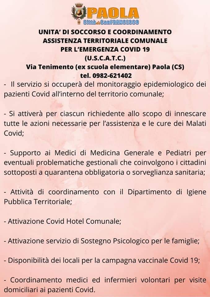 I locali, saranno ubicati nell’ex scuola elementare di Via Tenimento a Paola. L’Uscatc si attiverà per ciascun richiedente allo scopo di innescare tutte le azioni necessarie per l’assistenza e le cure dei Malati covid. Ad esprimere soddisfazione, è il segretario-questore dell’assemblea Regionale, On. Di Natale “Medici, infermieri e volontari si dedicheranno al nostro territorio per non lasciare nessuno indietro.