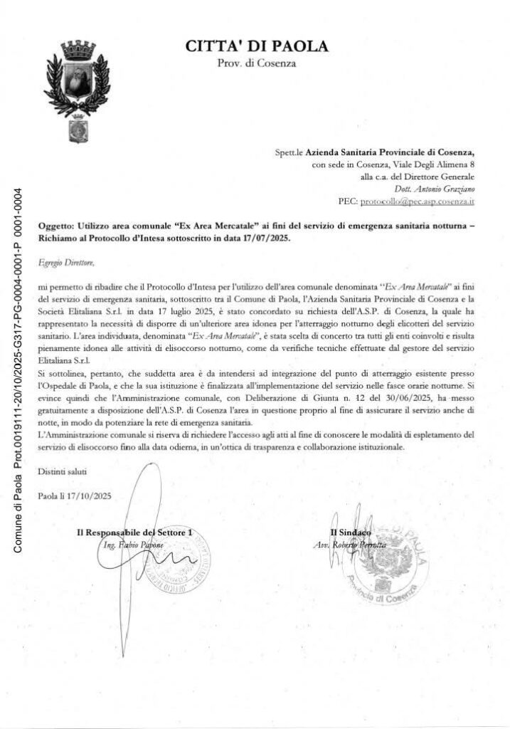 PAOLA- Il sindaco Roberto Perrotta ha diffuso una nota ufficiale indirizzata al direttore generale dell’ASP di Cosenza, Antonio Graziano, datata 17 ottobre 2025, con la quale ha inteso chiarire la posizione dell’amministrazione comunale (foto di seguito).