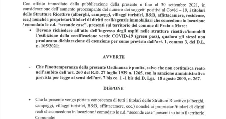 Di qui l’ordinanza del sindaco della Città dell’Isola Dino, con cui è stato disposto che anche i proprietari di seconde case dovranno chiedere il “Green Pass” agli affittuari.
